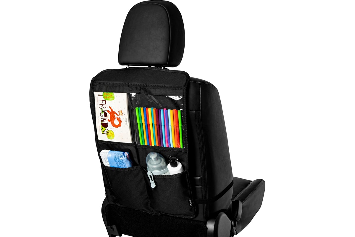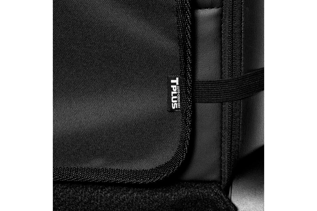 Органайзер Tplus на спинку сиденья с 3 карманами 400x600 мм, оксфорд 600, чёрный T015323 - удобный и вместительный органайзер на спинку сиденья с 3 карманами, который поможет аккуратно и компактно разместить большое количество разнообразных вещей в салоне автомобиля. Плоский карман на липучке из ПВХ пленки может использоваться для хранения планшета, смартфона, печатной продукции, документов и многого другого. В двух нижних карманах с легкостью разместятся вещи, игрушки, влажные салфетки, напитки и другие необходимые в дороге предметы. В верхней части аксессуара вшит пластик, придающий ему форму. Крепится регулируемой строповой лентой с застежкой фастекс за подголовник сиденья и эластичной резинкой в его основании.