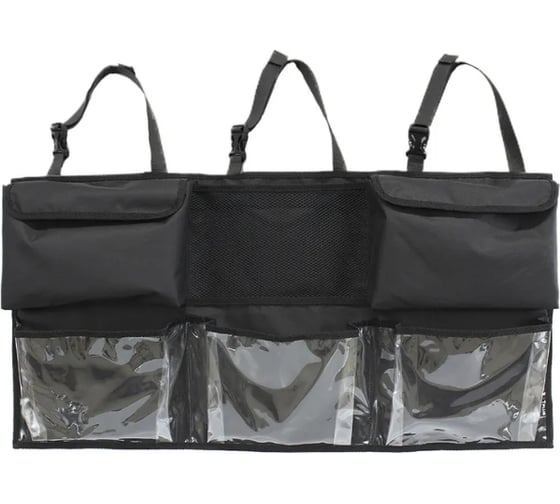 Органайзер Tplus на спинку заднего сиденья 940x470 мм, 3/3 секции оксфорд 600 чёрный T018157 поможет навести порядок в багажнике автомобиля и обеспечит быстрый доступ к необходимым вещам. В верхней части изделия размещены три вместительные секции: две объемные секции с крышками-клапанами на липучках и плоская секция из однослойной сетки. На задней стенке плоской секции располагается держатель из эластичной ленты (пять отсеков) для различной мелочи. В нижней части аксессуара находятся три большие секции, выполненные из прозрачного ПВХ материала. Органайзер крепится в трех местах за подголовники заднего сиденья с помощью полиэстеровых лент на застежках фастекс. Дополнительная фиксация изделия на спинке заднего сиденья достигается за счет контакт-ленты, прошитой по его периметру.