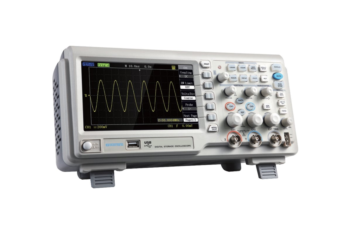 Двухканальный цифровой осциллограф Atten (Gratten) GA1202CAL – незаменимый инструмент для тех, кто проектирует, производит или ремонтирует электронное оборудование. Он сочетает в себе прекрасную функциональность, высокие технические характеристики и доступную цену. Прибор поддерживает автоматические (до 32-х параметров) и курсорные измерения, различные режимы синхронизации запуска, имеет расширенные возможности по анализу сигнала. Полоса пропускания до 200 МГц и частота семплирования до 2 Гвыб/с осциллографа предоставляют широкие возможности для отладки сложных схем. Надежный и удобный в эксплуатации прибор с глубиной памяти 40 тысяч точек, имеет небольшой вес и размер, высокую временную и температурную стабильность.