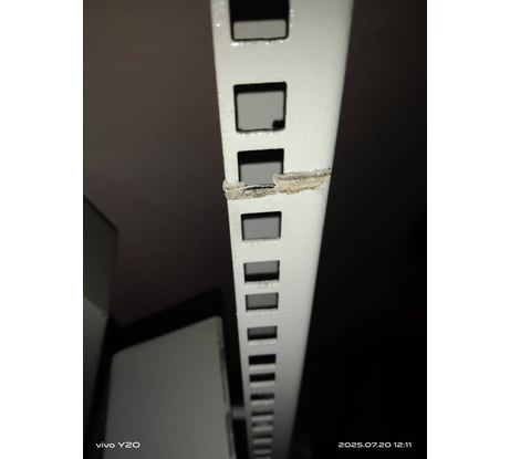 Начнем по порядку: 1. Нет болтов крепления рамки к стойкам основания. 2. Краска отлетает только так. 3. Множественные повреждения ЛКП 4.ножки из-за краски не удается отругулировать 5. Самое ужасное: ни одно оборудование для 19 стойки не удалось закрепить с двух сторон. Расстояние между сторонами рамки больше стандарта на 5мм. Такое же оборудование стоит в нсерверном шкафу отлично.