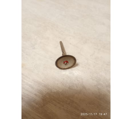 Толщина диска 0.21мм. Зубцы круглые - на них нет режущей кромки, т.е. они трут, мнут, гладят материал, но не грызут и не режут. Оправка кривая, неработоспособная. Вообще, оправки это очень грустная история - у меня из девяти оправок разных наборов только две неидеальной, но вменяемой центровки.