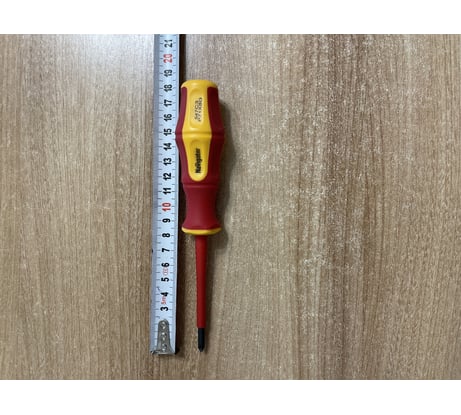 Общая длина изделия: 180мм. Диаметр стержня изделия составляет 4.5мм, при этом он изолирован специальным покрытием. Отвертка диэлектрическая и потому в первую очередь предназначена для работ под напряжением (до 1000В). Там же присутствует маркировка: "IEC 60900 / 1000V 22". Наконечник отвертки намагничен, что создает удобства при работе с мелкими метизами, а также их поиска.