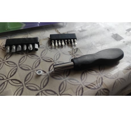 1. металлическая трубка - держатель бит запаяна в рукоятку криво. 2. сама пластиковая рукоятка тонкая (гораздо тоньше, чем кажется на фото) – не удобно использовать отвертку при закручивании. 3. посадочное место под биты имеет бОльшую проточку, чем сами биты. Биты здорово шатаются в ней. 4. Магнитик слабенький и сразу же вывалился из посадочного места под биты. Пришлось сажать его на клей.
