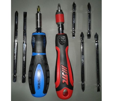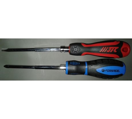 У большинства отвёрток подобного типа бита при установке упирается в пластик рукоятки, что негативно сказывается на сроке службы отвёртки. У этой отвёртки и у JTC (код товара: 16380623) механизм удержания биты устроен так, что бита упирается в металл. Подходят как длинные биты, так и битодержатели. Держит крепко. На фотографиях для сравнения присутствует и отвёртка JTC (код товара: 16380623).
