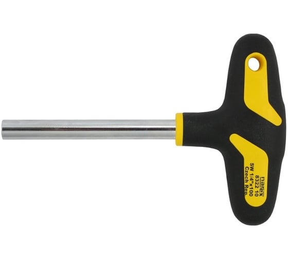 Отвертка для бит NAREX S Line Profi 832210 имеет удобную Т-образную форму ручки, материалом для изготовления которой служит сочетание твердого полипропилена и мягкого термопластичного эластомера. Рабочая часть инструмента изготовлена из прочной высоколегированной стали с антикоррозийным хромовым покрытием. Наконечник изделия представлен в виде внутреннего шестигранника 1/4" для вставки бит. Диаметр стержня равен 10 мм, длина - 90 мм. Рукоятка имеет размеры 100х50 мм. Данная модель отвертки обеспечивает высокий крутящий момент.