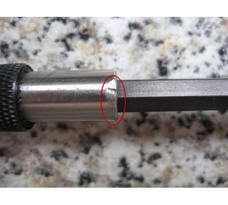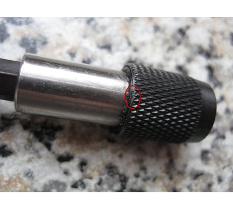 Держатель бит запрессован криво (см. фото). По сравнению с другими держателями имеет небольшую глубину и большие допуски по внутренним размерам, из-за чего бита сильно болтается при работе.