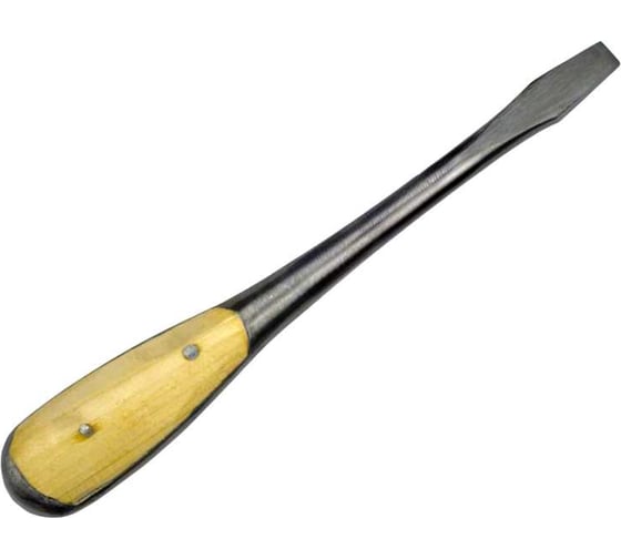 Инструмент изготовлен из качественной инструментальной стали, которая обладает хорошей прочностью. Длина стержня – 130 мм, что обеспечивает достаточную длину для работы в труднодоступных местах. Рукоятка отвертки – длина 70 мм – изготовлена из качественного дерева, что обеспечивает комфорт при использовании. Деревянная рукоятка также имеет хорошие амортизационные свойства, которые позволяют снизить воздействие ударов молотка на руки пользователя.