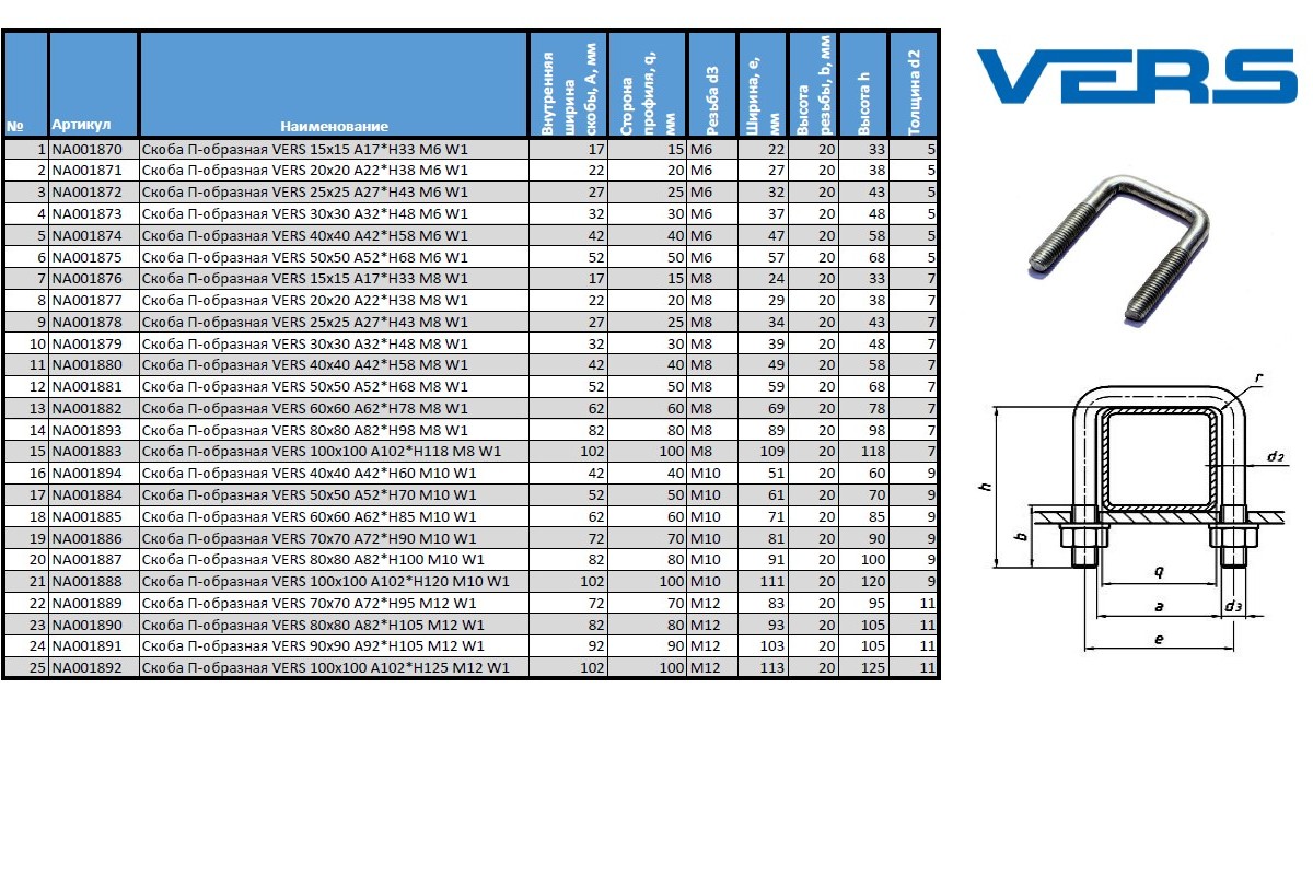 Технические характеристики скобы Vers 90x90, A92-H105, М12, W1