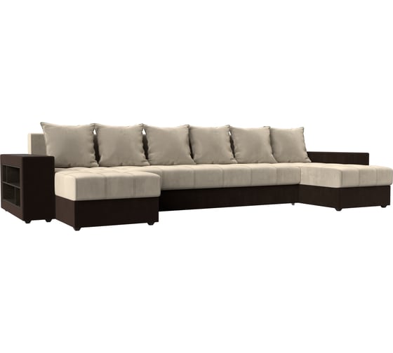 Большой п-образный диван Дубай универсален в использовании. Верх подлокотников – деревянные мини-столики. Сбоку имеются глубокие полочки для хранения предметов декора. Спинка состоит из 6 мягких подушек под цвет обивки. По углам располагаются вместительные ящики для белья.