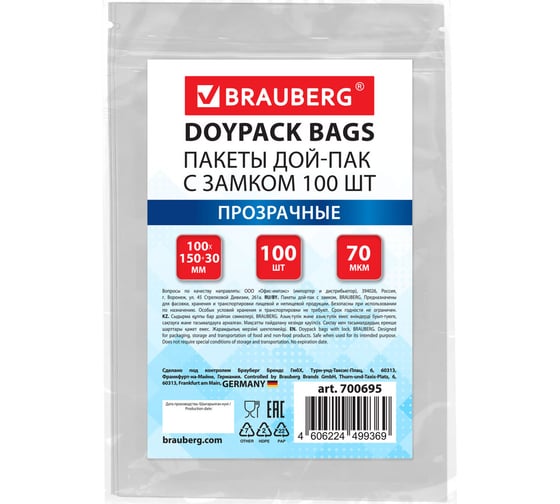 Пакет BRAUBERG Дой-Пак с замком зиплок, прозрачный, 100 х 150 + 30 мм, 100 штук, 70 мкм 700695
