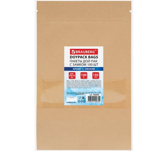 Пакеты дой-пак BRAUBERG – современный формат упаковки, идеально подходящий для хранения и транспортировки самых разных продуктов: круп, орехов, сладостей, чая, кофе и др. Благодаря эргономичной форме они занимают минимум места, а застежка ZIP LOCK обеспечивает герметичность и защиту от влаги, воздуха и загрязнений. Снаружи изделия выполнены из крафт-бумаги, внутри – из прозрачного полиэтилена, и оснащены окошком 60х200 мм для удобной идентификации содержимого.