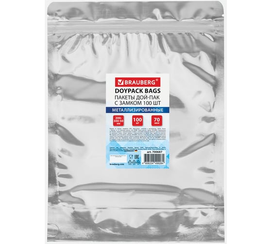 Пакеты Дой-Пак BRAUBERG с замком зиплок, метал+прозрач. стенка, 200х300+50мм, 100шт, 70 мкм, 700687