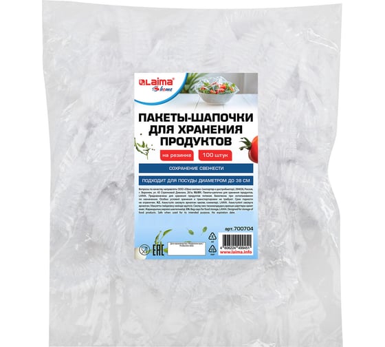 Пакеты-шапочки LAIMA для хранения продуктов, на резинке 38 см, КОМПЛЕКТ 100 штук, Home 700704