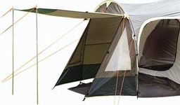 Просторный тамбур. Тамбур в четырехместной палатке кемпинговой Holiday GLOBE H-1035 на отдельной консольной дуге с полом. В нем можно расположить стул для удобного размещения под козырьком. |