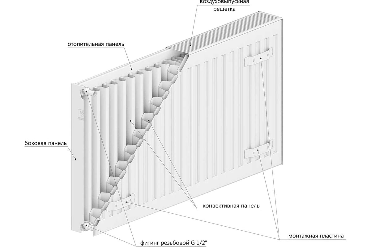 Панели радиатора изготовлены из стали толщиной 1,2 мм, отличаются высокой теплоотдачей и низкой инерцией: быстро нагреваются и, при необходимости, быстро остывают. Пара встроенных между отопительными панелями конвекторов представляет собой рифленые стальные листы (толщина стали 0,4 мм). П-образная форма конвекторов создает потоки теплого воздуха, которые поднимаются вдоль «ребер» и нагревают помещение.