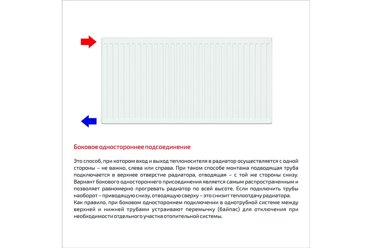 Радиатор производится без приваренных элементов крепления, что позволяет использовать его как для подключения слева, так и справа, а также повысить эстетическую привлекательность радиатора при использовании совместно с напольным креплением.