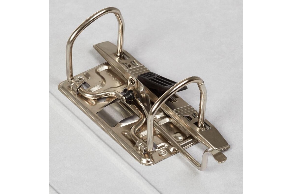 Металлический арочный механизм не съемный. Специальные прорези на крышке не дают папке открываться при большом количестве вложенных документов. На корешке имеется карман со сменной этикеткой, есть кольцо для удобного захвата.