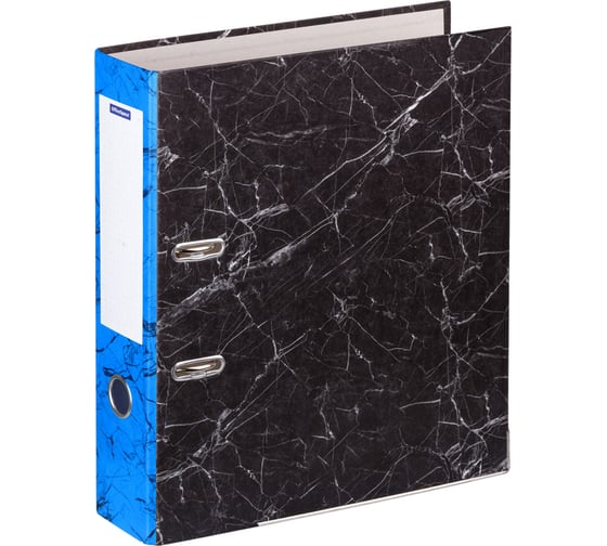 Папка-регистратор OfficeSpace 70 мм, мрамор, черная, синий корешок, нижний металлический кант 274411 предназначена для хранения документов, металлический арочный механизм, покрытие офсетная бумага. На корешке этикетка для записей. Формат А4+. Ширина корешка 70 мм. Нижние грани укреплены металлическим кантом.