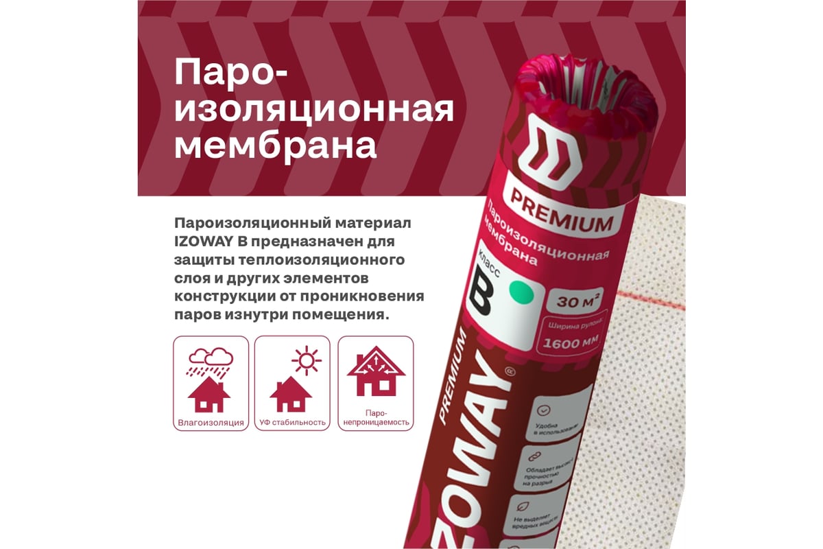 Пароизоляционная мембрана Izoway B Premium 30 кв. м 18877 защищает утеплитель, строительные конструкции и внутренние элементы стен от насыщения водяными парами внутри помещения (дыхание человека, пар из теплых влажных помещений). Предотвращает проникновение частиц волокнистого утеплителя во внутреннее пространство здания.