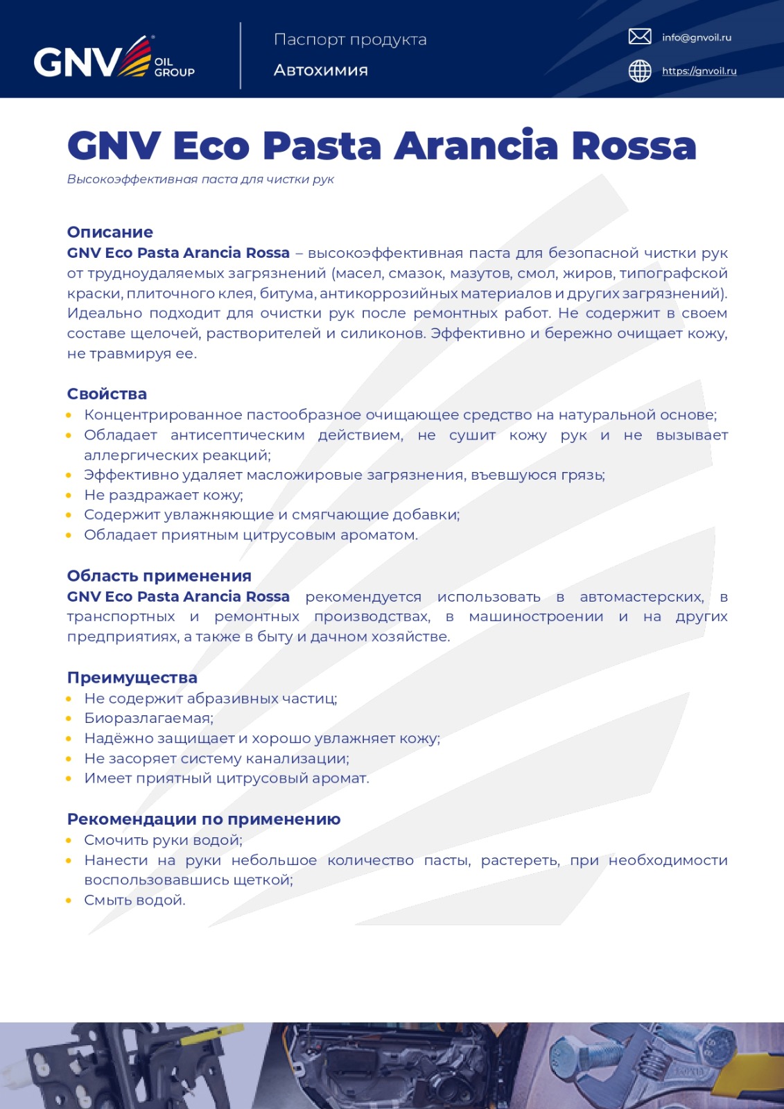 GNV Eco Pasta Arancia Rossa – высокоэффективная паста для безопасной чистки рук от трудноудаляемых загрязнений (масел, смазок, мазутов, смол, жиров, типографской краски, плиточного клея, битума, антикоррозийных материалов и других загрязнений). Идеально подходит для очистки рук после ремонтных работ. Не содержит в своем составе щелочей, растворителей и силиконов. Эффективно и бережно очищает кожу, не травмируя ее.