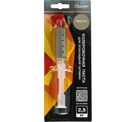 Колеровочная паста поставляется в шприцах и точно расфасована для колеровки эпоксидной затирки «Диамант» фасовками 1 кг. и 2,5 кг.