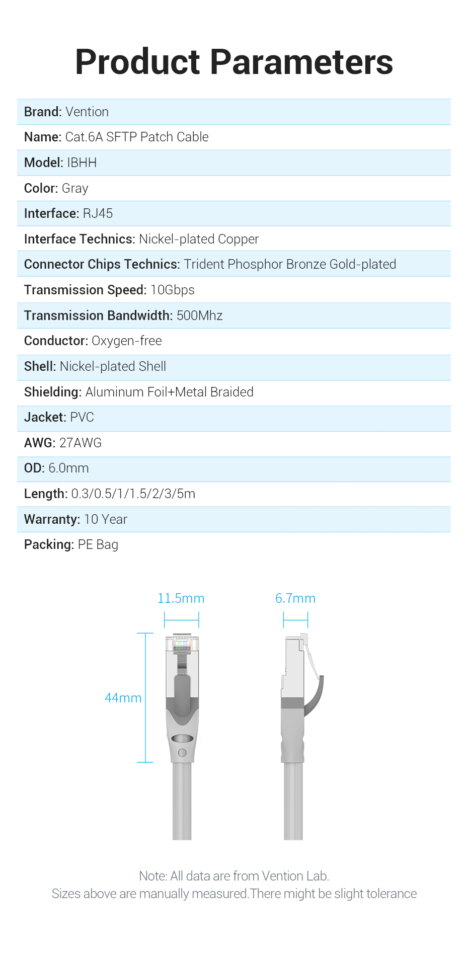 Технические характеристики VENTION SFTP cat.6A, RJ45 - 2м. Серый IBHHH