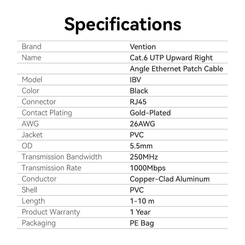 Патч-корд VENTION прямой UTP cat.6, RJ45/RJ45 угол 90гр.вверх - 1.5м. Черный IBVBG