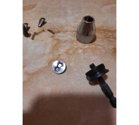 Поделка поработала немного и начала самоуничтожаться. Опорная тарелка для губок из пластилина, при деформации не зажимает губки ровно, резьба встает раком и получается фигурная резьба сверлом. Сверло 3мм зажимает нормально, если сверло закусит, поделка с него легко снимается рукой, зато сверло не ломает) если бы не позорное исполнение, для импакта хорошая оснастка. Гарантии на это великолепие нет, мой экземпляр полетел в мусорку.