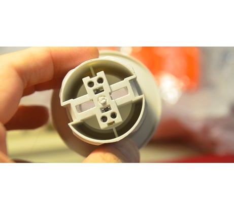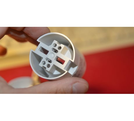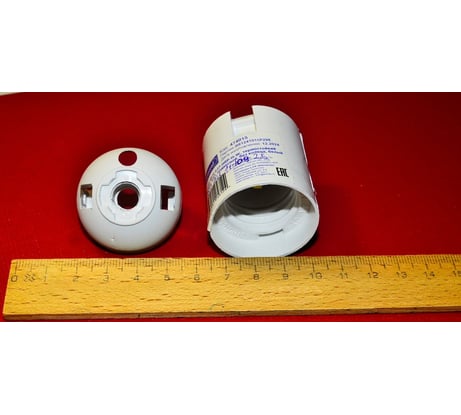 Патрон General Lighting Systems пластик Е27 подвесной (GLH-E27-HRP-H-W 474015). Пластик твердый, крепкий и гладкий, контакт спирали Е27 вроде надежный, "позолочен", контакт фазы как у всех - как из фольги дырявой, установочная часть полное дерьмо, провода не вставляются, ничего не фиксируется, сразу же вылетает. Основание-крепление имеет дырку под М10, сама спираль внутри пластиковая, но полимер более-менее твердый и фиксируется хорошо.