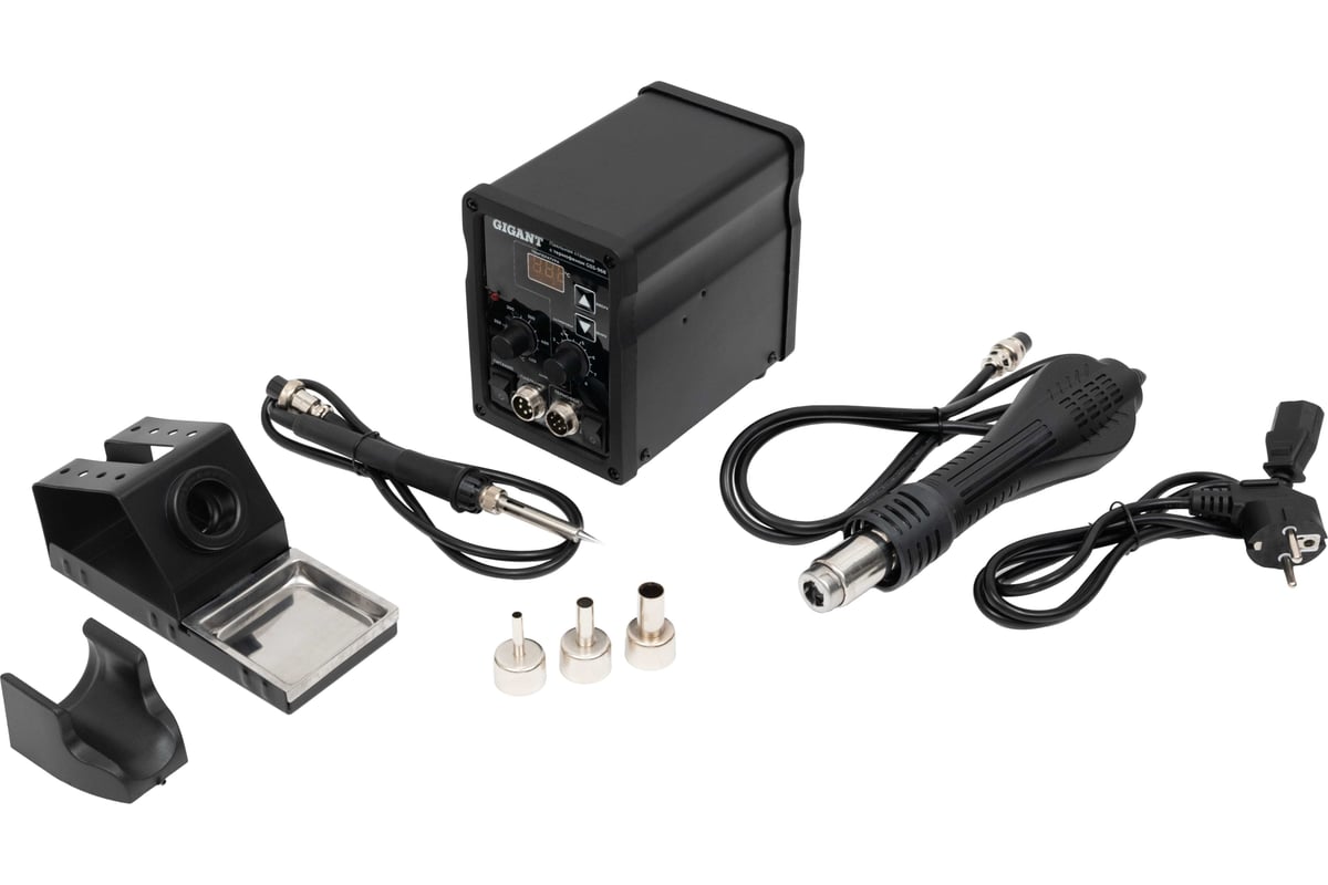 Паяльная станция Gigant с термофеном 600Вт GSS-968 служит для удобного и безопасного проведения процесса пайки или демонтажа различных видов компонентов (в том числе чувствительных, в корпусах: SOIC, PLCC, QFP, BGA и т. д.). Это надежный, удобный и производительный инструмент для профессионалов и любителей в области электроники.