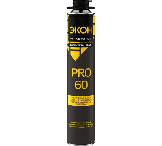 Монтажная пена ЭКОН ПРО 60 представляет собой готовую к применению однокомпонентную полиуретановую пену, затвердевающую под воздействием влажности воздуха. Пена - саморасширяющийся продукт, увеличивающийся в процессе застывания в два раза. ЭКОН имеет прекрасную адгезию к дереву, бетону, камню, металлу и т.д. Поверхность может быть влажной, но не замерзшей и покрытой льдом. Выход главным образом зависит от рабочих условий — температуры, влажности воздуха, доступного для расширения пространства и т.д.