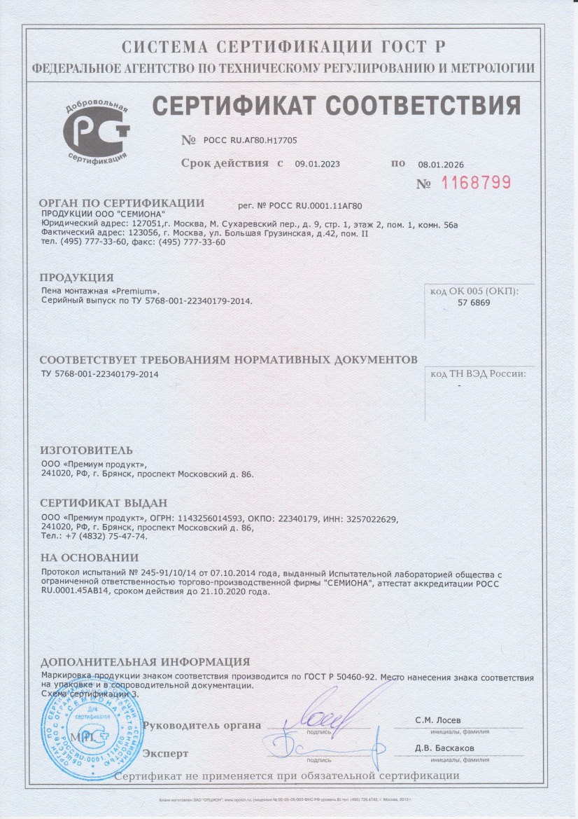 Клей-пена монтажная PREMIUM 1000 мл баллон I16545 - применение пены эффективно проявляется при герметизации трещин и щелей в поверхности несущих элементов, в процессе монтажа дверных и оконных конструкций, подоконников, а также изделий из прозрачных материалов. Пена может использоваться в качестве теплоизолятора при устранении эксплуатационных дефектов здания.
