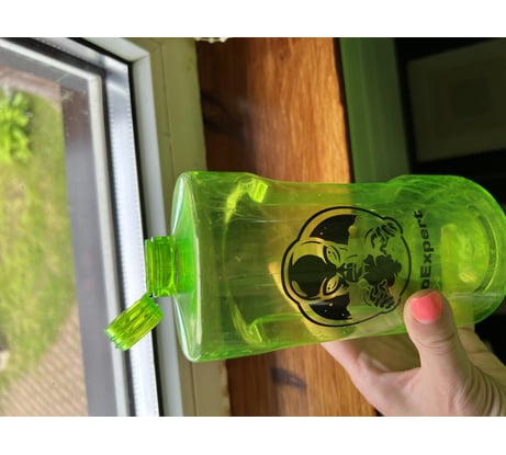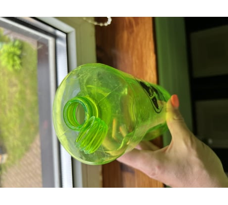 После 1 мойки рассыпалась резьба бутылки на мелкие кусочки. Красивая бутылка на помойку. Взял обычную из под жидкого мыла для рук.