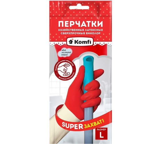 Komfi - хозяйственные перчатки из натурального латекса БИКОЛОР. Отличием от обычных хозяйственных перчаток является наличие двух зон: зона усиленного латекса (кисть) и зона без усиления (манжета) Это обеспечивает повышенную прочность и долговечность перчаток, а особая текстура на ладонях позволяет надежно удерживать в руках даже скользкие предметы. Предназначены для уборки и мытья полов, чистки в санузлах, мытья посуды, работы на приусадебном участке, при работе с химическими бытовыми средствами.