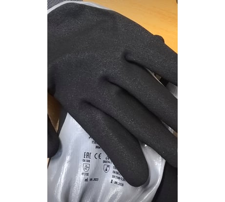 - Песочное нитриловое покрытие на ладони обеспечивает гибкость и отличную цепкость даже с замасленной и влажной поверхностью