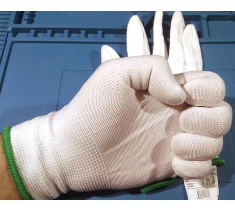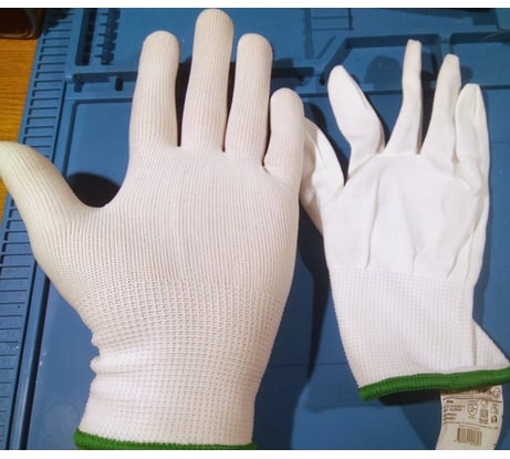 Чистые перчатки из белой нейлоновой пряжи. Бесшовная основа 13го класса вязки прекрасно вентилируется и не оставляет ворсинок. Универсальны, применяются для любых механических работ. Двойной оверлок с латексным кольцом обеспечивает превосходную фиксацию перчатки на запястье.Цветная индикация размера по оверлоку.