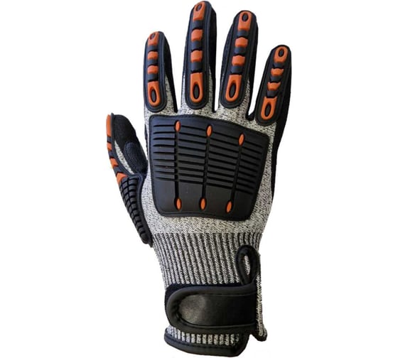 Антивибрационные трикотажные бесшовные перчатки для тяжелых работ. Покрытие в наладонной части из вспененного нитрила с песочной текстурой. Накладки из ПВХ резины на тыльной стороне для защиты от ударных воздействий. Основа: HPPE волокно, спандекс, нейлон, стекловолокно. Уровень защиты от пореза – 5. Максимальная устойчивость к истиранию и разрывам. Отличное сцепление со скользкими предметами.