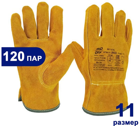 перчатки цельноспилковые ARCTICUS из КРС желтого А кл, резинка на запястье, р.11, коробка 120 пар 20020-11120