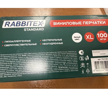 Перчатки виниловые универсальные RABBITEX 50 пар (100шт), р.XL(оч.большой), белые 702166