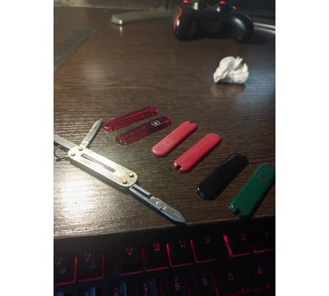 Брал для ремонта victorinox 58мм. Накладки оригинал, качество отливки хорошее, даже лучше чем орига 10 летней давности. Дешевле не найти. 1. Старые накладки снимаются канцелярским ножом, держатся на латунных фиксаторах. 2. Если захотите снять и поставить назад, скорее всего не прокатит, часто ломается выемка в накладке и отходит потом. 3. Держится только на фиксаторах, клея/герметика нет. 4. Перед посадкой очистите основание ножа (+я шлифовал малость 2000 абразив), фиксаторы не шлифовать!!!! Я пресовал между двумя книгами (точно приложил накладки, немного прижал и простучал между книгами легонько.