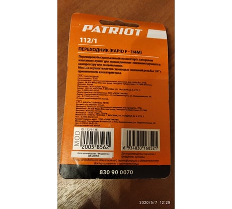 Отзывы о переходнике 112/1 Rapid - 1/4M PATRIOT 830900070