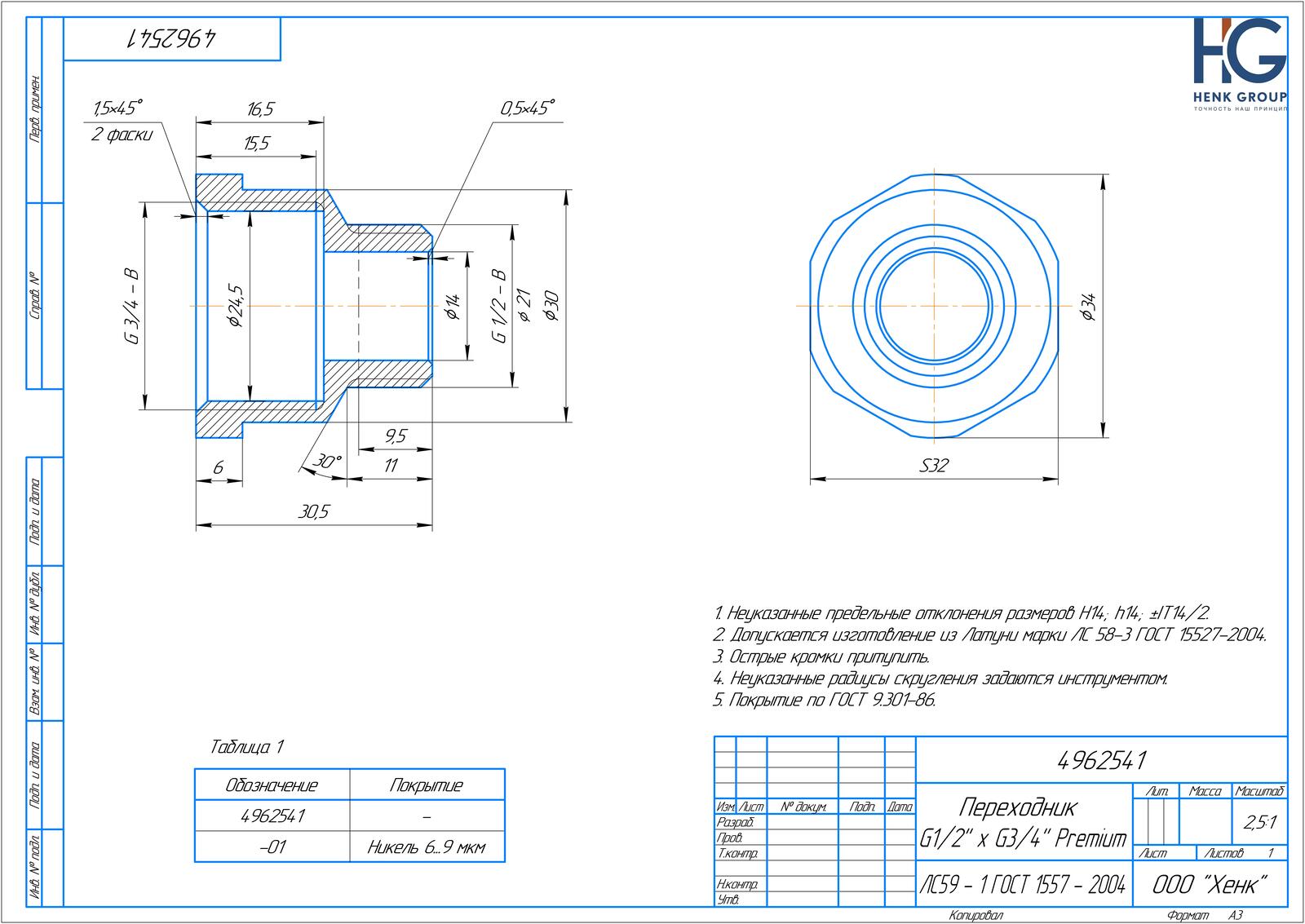 Фитинг имеет центральный участок в виде шестигранника под гаечный ключ для удобства монтажа. Наружная резьба 1/2 дюйма и внутренняя резьба 3/4 дюйма, шаг резьбы 1,814 мм.