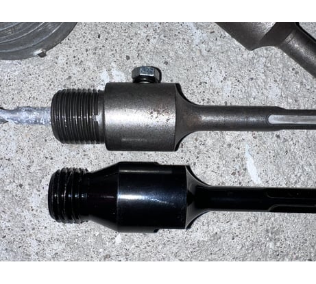 Только для лёгких материалов с небольшими усилиями (пенобетон, кирпич и т.п.) !!! Не подходит для армированного бетона, сломаете сразу хвостовик sds+! Имейте ввиду, этот переходник НЕ ПОДХОДИТ (!!!) для коронок с центровочным сверлом , хотя имеет тот же диаметр 22мм, но БОЛЬШИЙ (!) шаг резьбы (см. фото) !!!