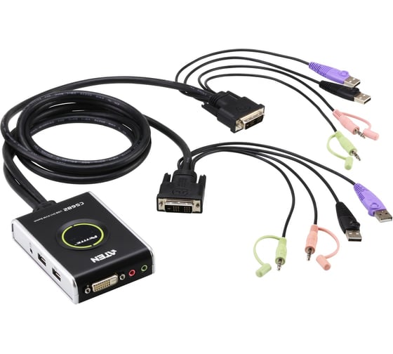 Переключатель ATEN USB KVM+Audio, 1 user USB+DVI-D = 2 cpu USB+DVI-D, со встр.шнурами USB+Audio 2x1.2м., 1920x1200, настол., исп.стандарт.шн CS682-AT