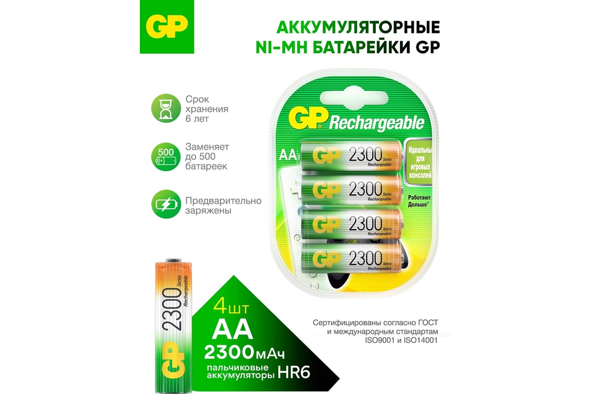 Перезаряжаемые аккумуляторы GP 230AAHC AA, емкость 2300 мАч - 4 шт. 230AAHC-2DECRC4 GP 230AAHC-2DECRC4 идеально подходят для использования в компьютерных мышках, клавиатурах, детских игрушках, часах, радиоприборах и других бытовых устройствах.