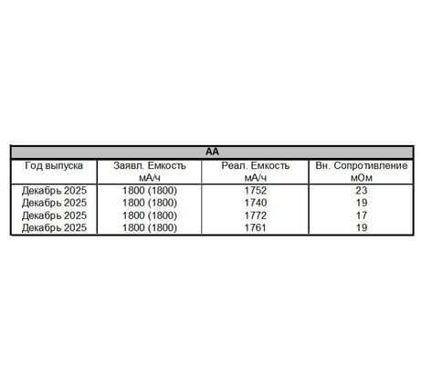 Покупал 2х2 (4 штуки) на 1800 мА/ч, т.к. все, что больше заявленной емкостью в формате АА по моему опыту не служат долго и имеют большой "недовес". Одновременно покупал шесть ААА. Впервые GP меня разочаровал с ними. Отзыв есть тут: https://www.vseinstrumenti.ru/product/perezaryazhaemye-akkumulyatory-gp-100aaahc-emkost-1000-mach-6sht-100aaahc4-2-2cr6-991218/ Эти существенно лучше! Дата выпуска, а точнее упаковки - декабрь 2025. Проверял анализатором Liitokala Engineer Lii-500. Ток заряда/разряда 500мА. Меньше 3С, но на четыре аккума в этом анализаторе максимум. "Недовес" емкости есть на всех, но менее 5%. Терпимо, но за это минус один балл. "Игры с цифрами" в маркировке, как было в ААА, нет: указано 1800, то и на упаковке и мелким шрифтом на корпусе 1800. Не смотря на пресловутою надпись "series"... Внутреннее сопротивление по трем меньше 20 мОм, один 23 мОм. Хороший результат! Но учитывая негативный опыт по ААА "1000 series" на 950 мА/ч (по факту около 900)к GP теперь буду относится с осторожностью. Срок эксплуатации заявлен 8 лет, но это покажет только время. Во всяком случае раньше GP работали долго...