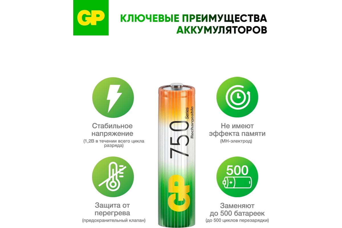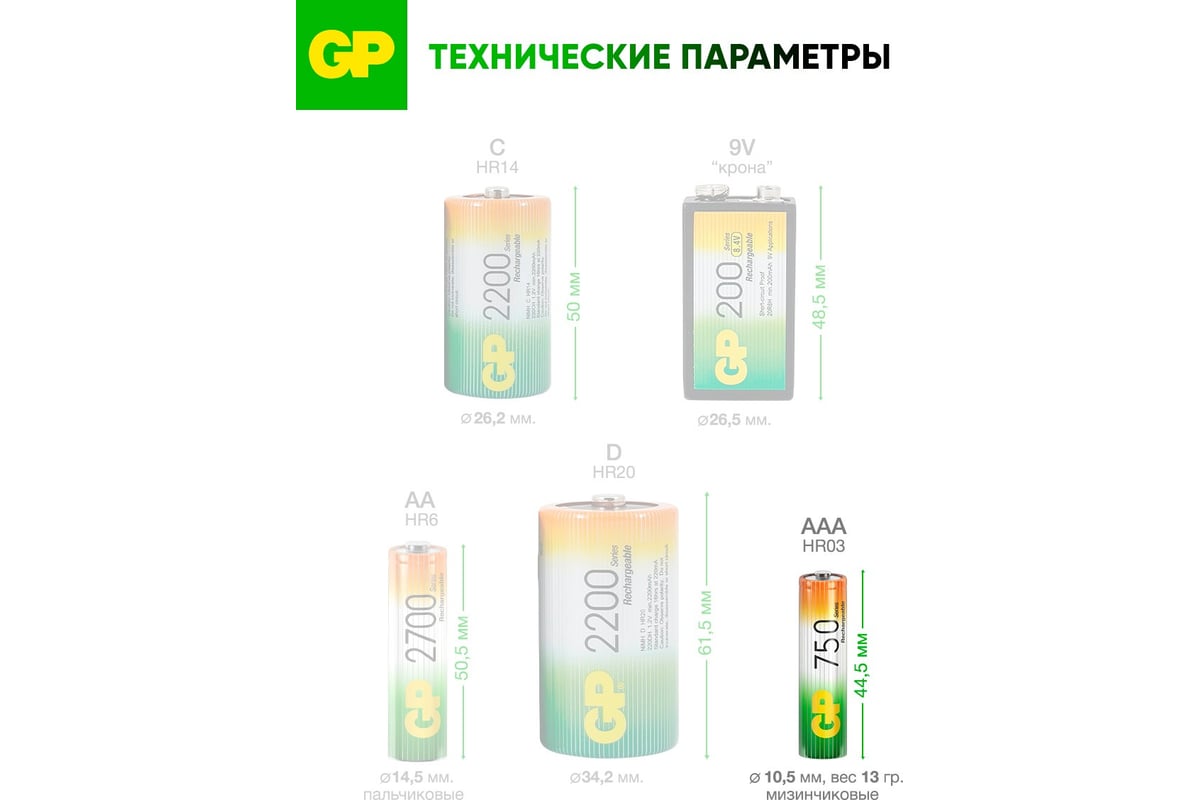 Аккумуляторы GP имеют низкий саморазряд – они сохранят более 70% энергии в течение 2-х лет после заряда.