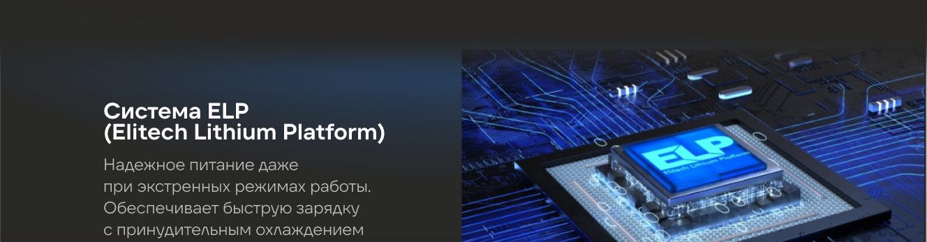 Является частью аккумуляторной платформы ELP (Elitech Lithium Platform), которая обеспечивает снижение теплового воздействия на аккумуляторы, увеличение их жизненного цикла, принудительное охлаждение и контроль всех параметров батареи в процессе зарядки.