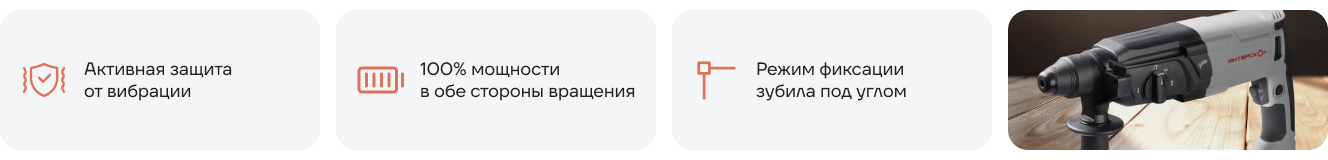 - Три режима - ударно-вращательный (бурение), вращательный (сверление без удара, возможно использование в качестве миксера), ударный (отбойные операции)