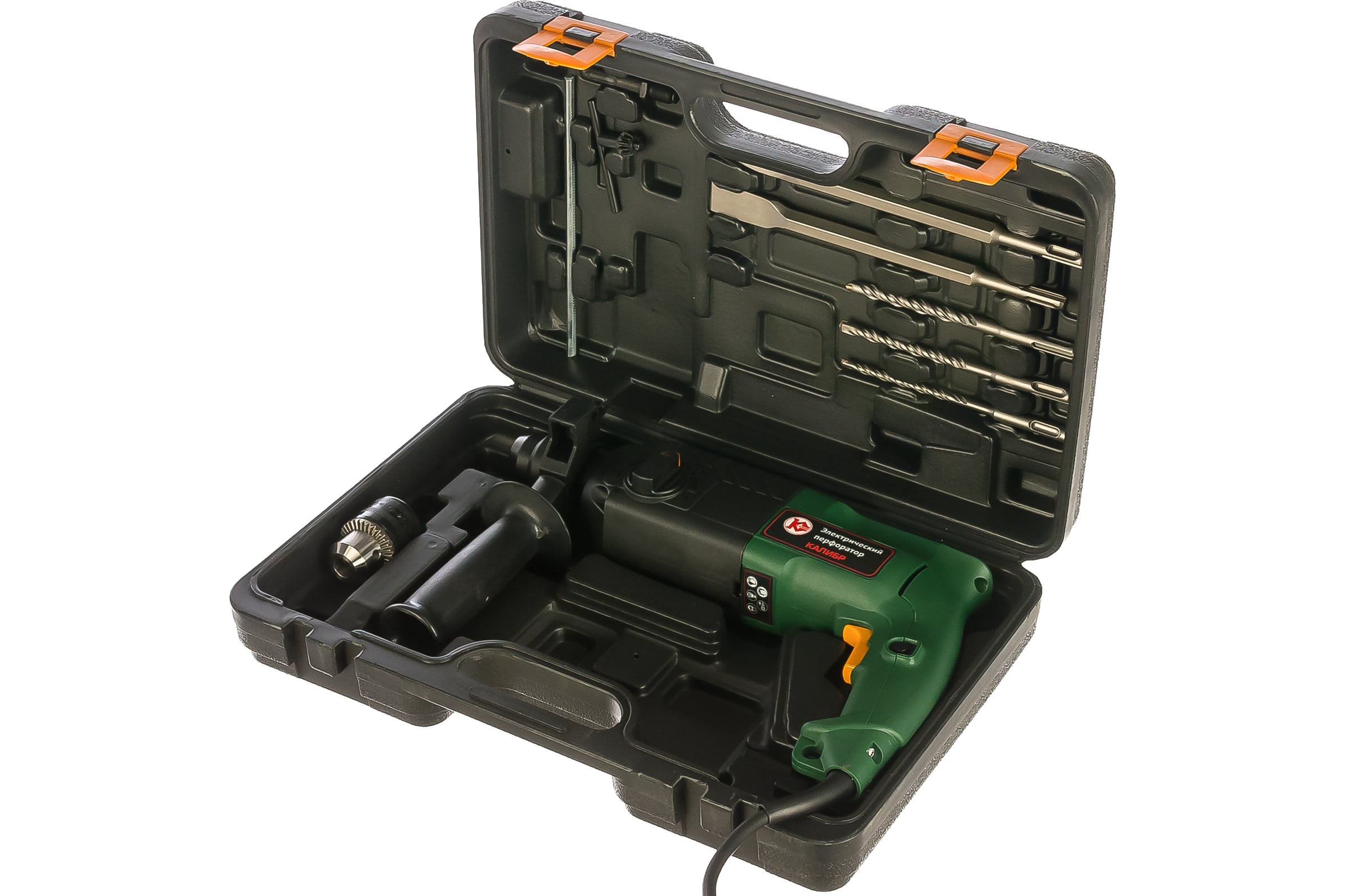 Достаточно мощный, приятным бонусом в комплекте буры. Все упаковано в чемодан. Работает уже несколько лет.